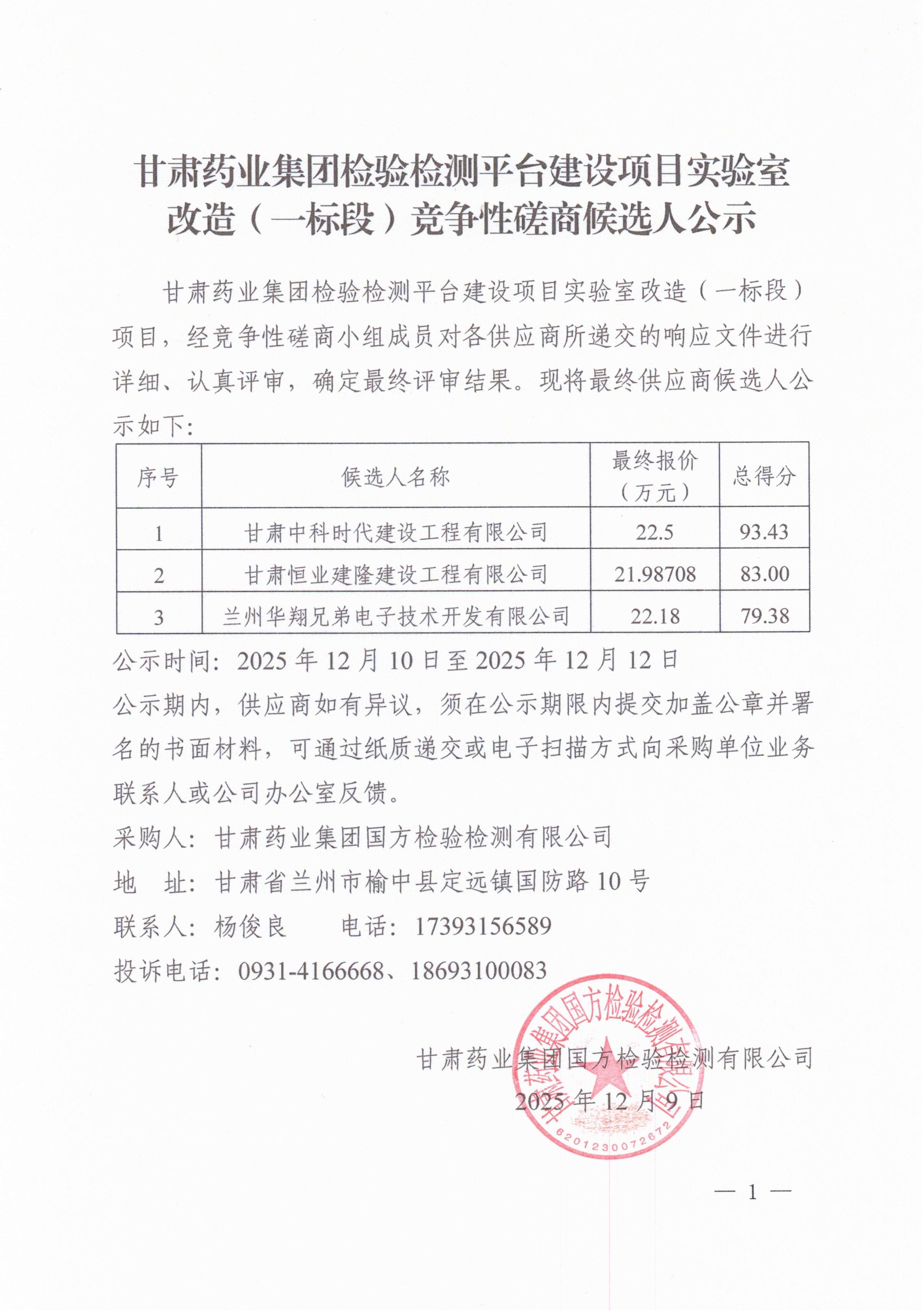 甘肅藥業(yè)集團檢驗檢測平臺建設項目實驗室改造(一標段)磋商中標公示